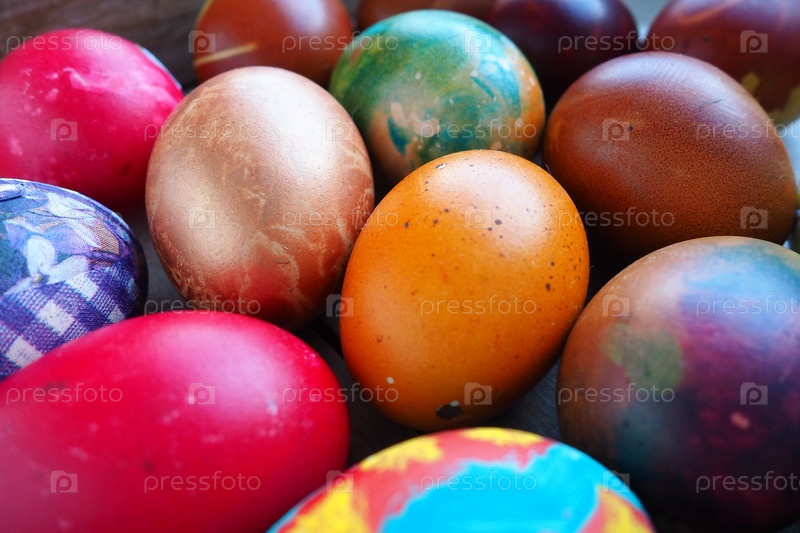 Красочные пасхальные яйца крупным планом. Много красочных праздничных яиц сложены близко друг к другу. Вареные куриные яйца с цветочным и фантазийным узором. Яркий пасхальный фон