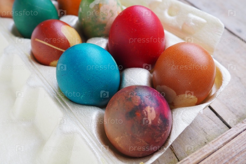 Красочные пасхальные яйца закрываются в пластиковой упаковке. Десять красочных праздничных яиц сложены близко друг к другу. Вареные куриные яйца с цветочным и фантазийным узором. Яркий пасхальный фон