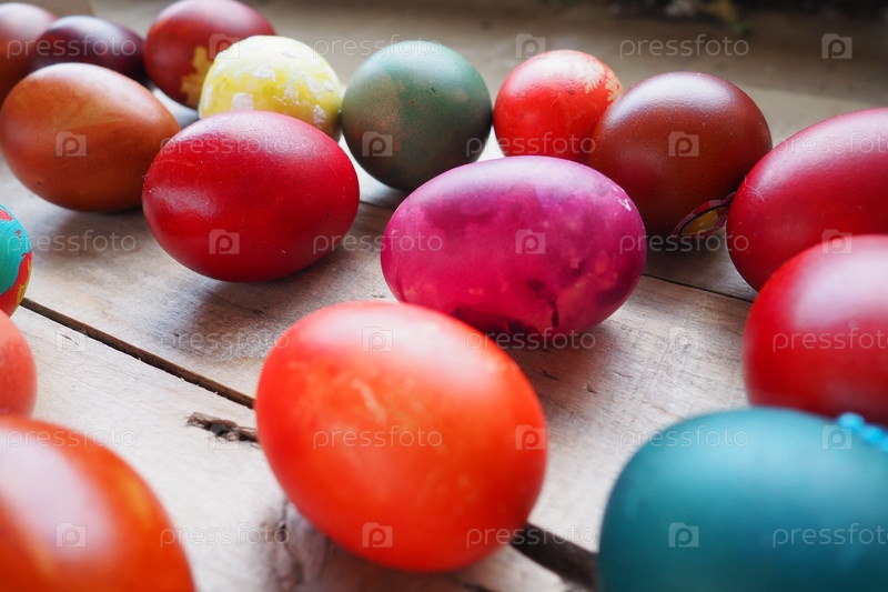Красочные пасхальные яйца закрываются на деревянном фоне. Много красочных праздничных яиц сложены близко друг к другу. Вареные куриные яйца с цветочным и фантазийным узором. Яркий пасхальный фон
