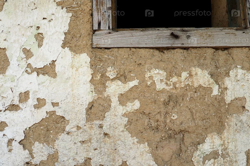 Стена жилого старого дома, построенного из кирпичей из глины, коровьего навоза и соломы. Отшелушивающая штукатурка. Сербия, старинная технология строительства. Текстура штукатурки и кирпичей. Окно с деревянной рамой
