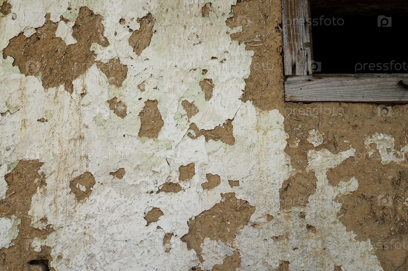 Стена жилого старого дома, построенного из кирпичей из глины, коровьего навоза и соломы. Отшелушивающая штукатурка. Сербия, старинная технология строительства. Текстура штукатурки и кирпичей. Окно с деревянной рамой