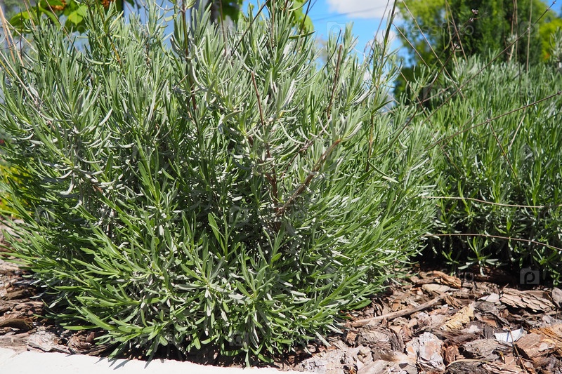 Серебристые листья, ветки кустов лаванды. Сад с кустами лаванды в солнечный день. Озеленение газона, общественного места. Посадка многолетней лаванды у бордюра, присыпание почвы щепой