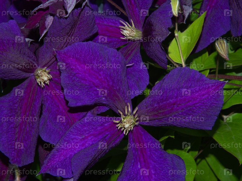 Элегантные фиолетовые цветы клематиса с текстурированными лепестками крупным планом в саду