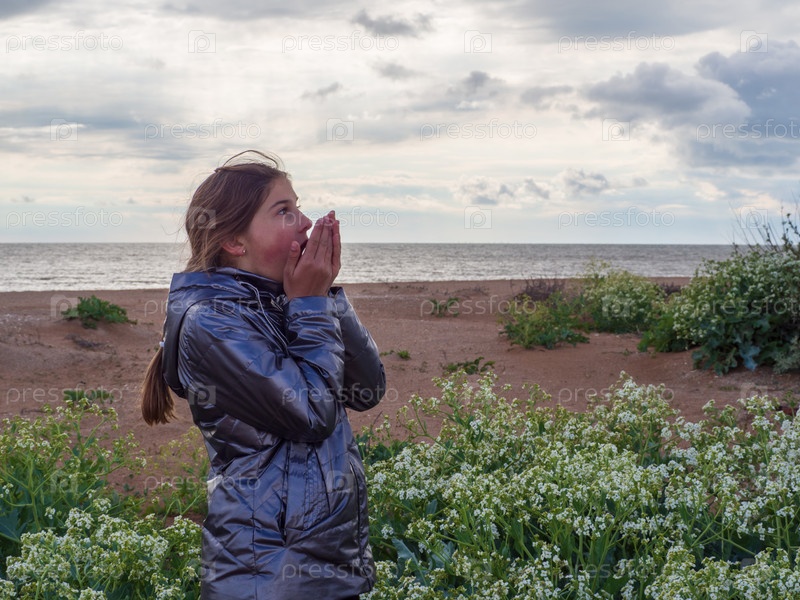 Девушка в сером жакете от удивления прикрывает рот ладонями, стоя в полевых цветах на фоне природы с морским пейзажем. Тенденция местных путешествий. Семейная прогулка путешественников