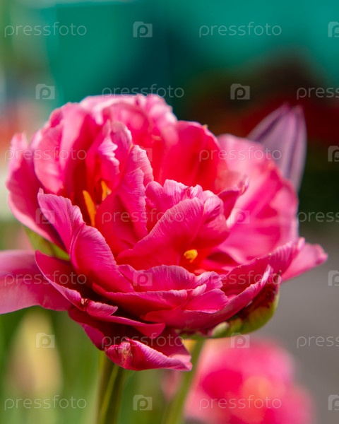 Натуральный необработанный розово-фиолетовый махровый цветок тюльпана в саду. Красно-розовый пионовидный тюльпан. малая глубина резкости, фокус. Цветочная весенняя открытка
