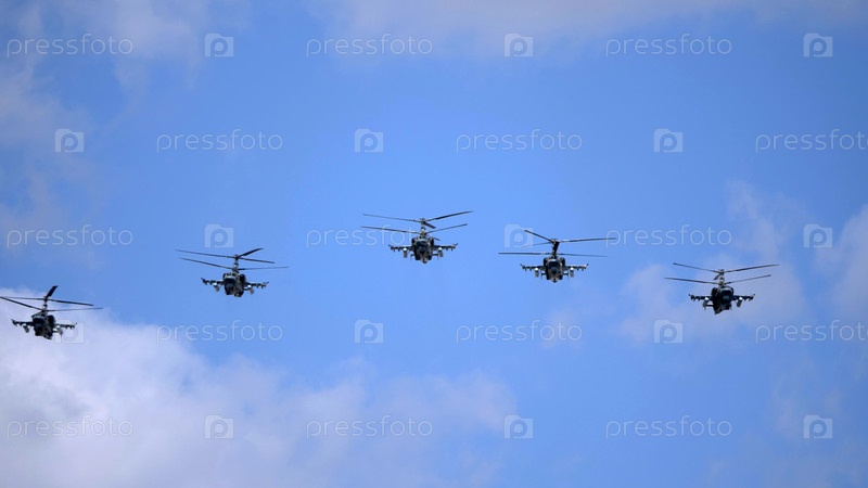 МОСКВА, РОССИЯ - 7 мая 2021 года: Авиапарад в Москве вертолет Kamov Ka-52 Alligator летает по небу на параде Победы во Второй мировой войне в Москве, Россия
