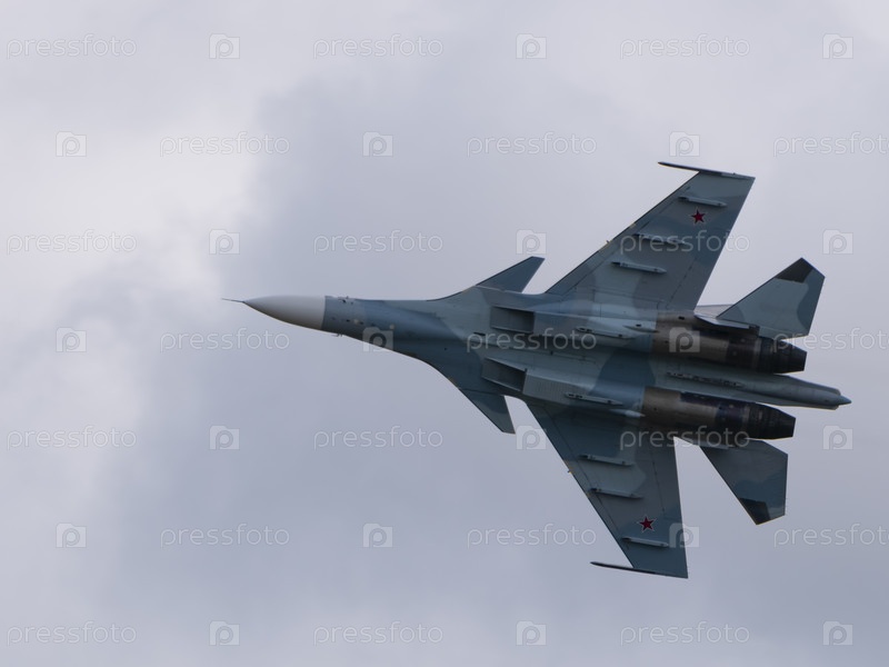 Москва Россия Аэродром Жуковский 25 июля 2021 года: пилотажный Су-30 выполняет демонстрационный полет международного аэрокосмического салона МАКС-2021