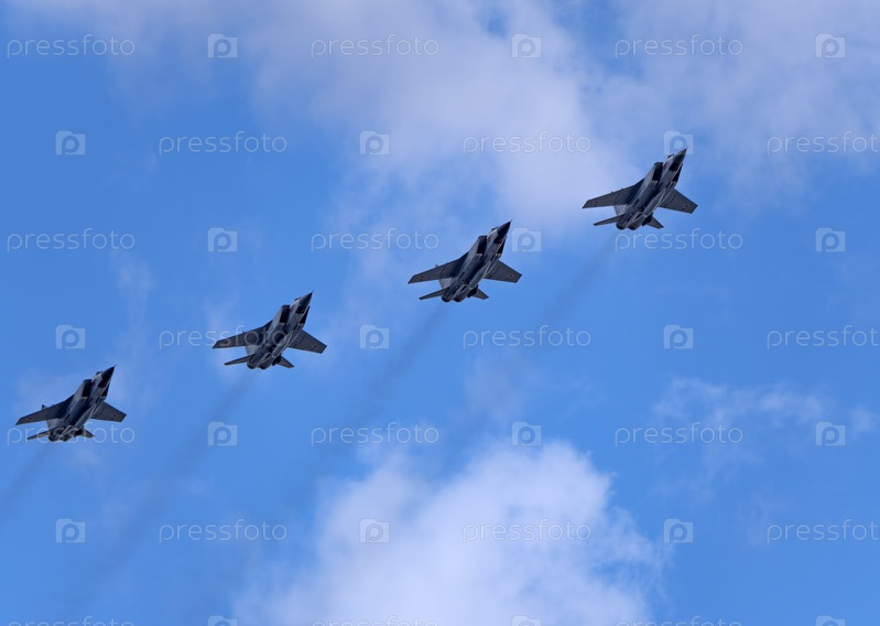 МОСКВА, РОССИЯ - 7 мая 2021 года: Авиапарад в Москве. группа реактивных истребителей Микоян МиГ-31 в небе на параде Победы во Второй мировой войне в Москве, Россия