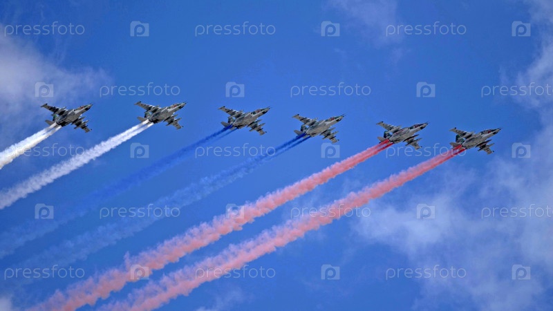 МОСКВА, РОССИЯ - 7 мая 2021 года: Авиапарад в Москве. Группа российских истребителей Су-25 с раскрашенным российским флагом в небе на параде Победы во Второй мировой войне в Москве, Россия
