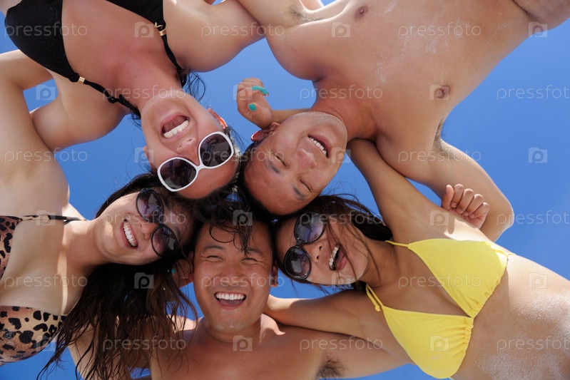 Группа счастливых молодых людей веселится на пляже