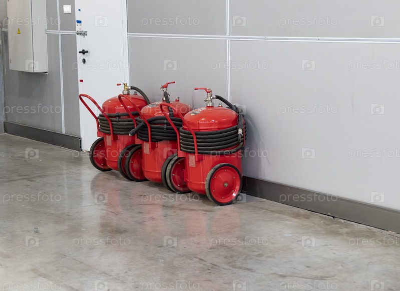 Три больших красных огнетушителя на колесах в комнате