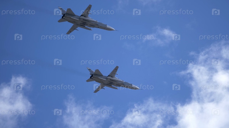 МОСКВА, РОССИЯ - 7 мая 2021 года: Авиапарад в Москве. реактивный истребитель Су-24 в небе на параде Победы во Второй мировой войне в Москве, Россия