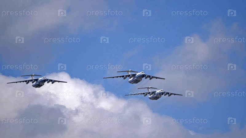 МОСКВА, РОССИЯ - 7 мая 2021 года: Авиапарад в Москве. 3 многоцелевых четырехмоторных стратегических авиалайнера Ильюшин Ил-76 летают в небе на параде Победы во Второй мировой войне в Москве, Россия