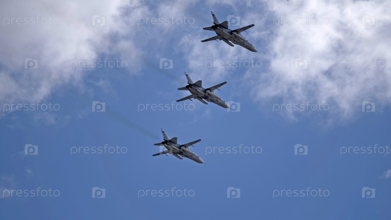 МОСКВА, РОССИЯ - 7 мая 2021 года: Авиапарад в Москве. реактивный истребитель Су-24 в небе на параде Победы во Второй мировой войне в Москве, Россия
