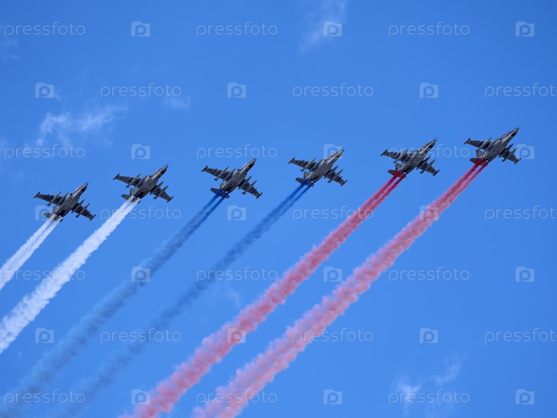 МОСКВА, РОССИЯ - 7 мая 2021 года: Авиапарад в Москве. Группа российских истребителей Су-25 с раскрашенным российским флагом в небе на параде Победы во Второй мировой войне в Москве, Россия