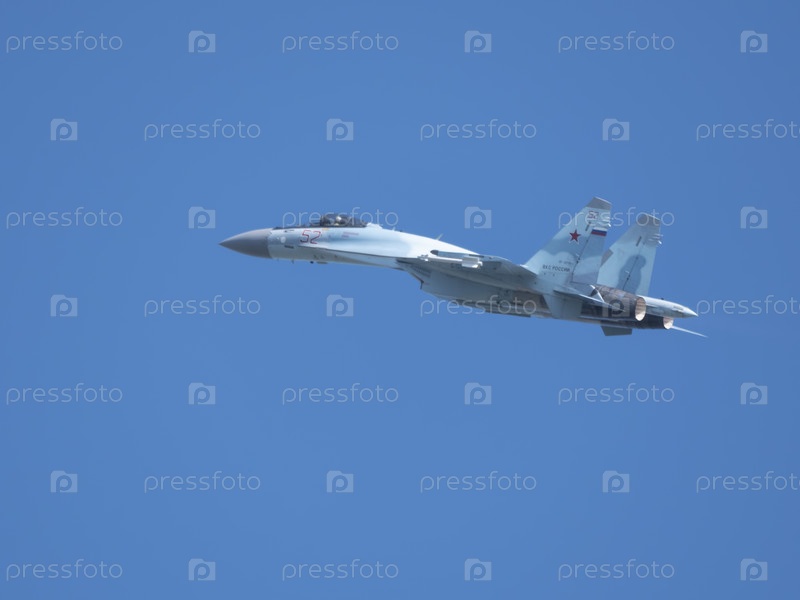 Москва Россия Аэродром Жуковский 31 августа 2019 года: пилотажный Су-35 выполняет демонстрационный полет международного аэрокосмического салона МАКС-2019