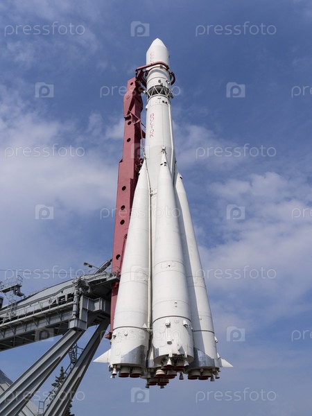 МОСКВА, РОССИЯ - 23 апреля 2019 г.: Ракета-носитель "Восток" в павильоне "Космос" на ВДНХ. Прогулки москвичей и туристов