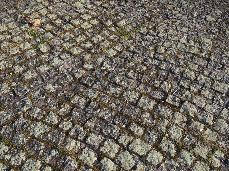 Аккуратно выложена старая брусчатка. Тротуар на площади старого города. Квадратные и прямоугольные камни на земле, покрытые мхом и лишайниками