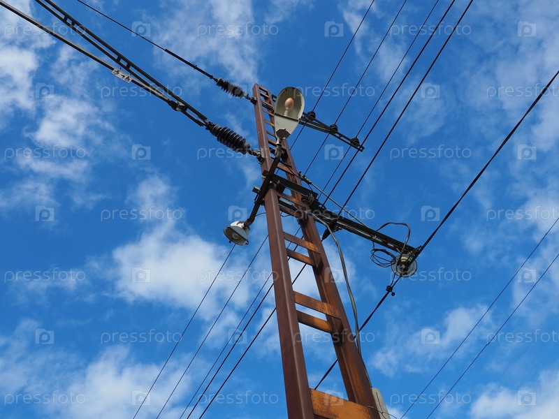 Опоры высокого напряжения против голубого неба и облаков. Столб с электричеством на вокзале. Электрические провода и оборудование для подачи электроэнергии