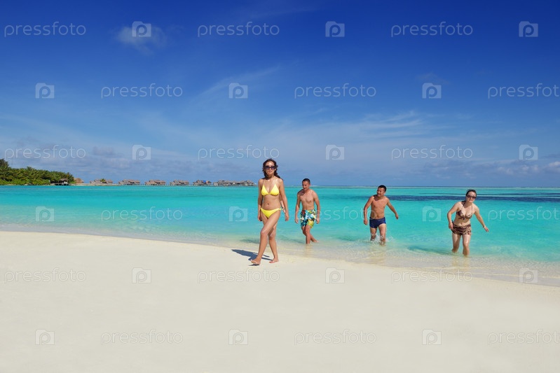 Группа счастливых молодых людей веселится на пляже