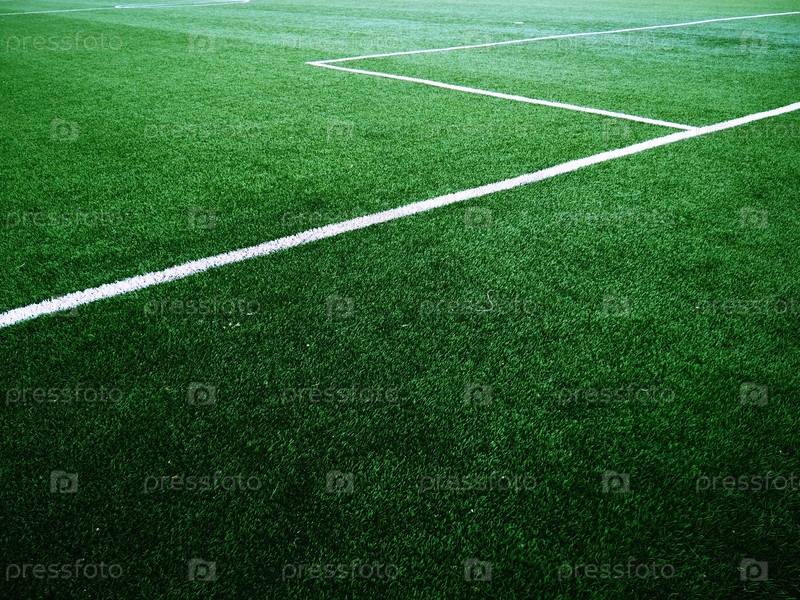 Разметка футбольного поля на зеленой траве. Белые линии шириной не более 12 см или 5 дюймов. Площадь футбольного поля