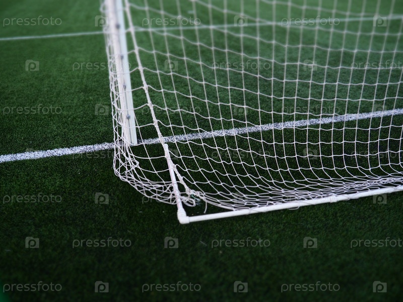 Сеть ворот футбола с предпосылкой травы. Маркировка и полосы футбольного поля