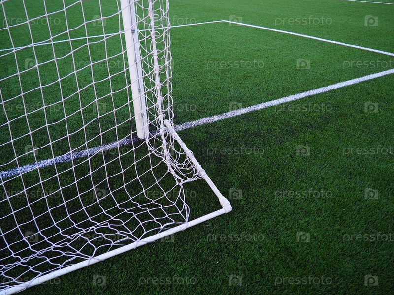 Сеть ворот футбола с предпосылкой травы. Маркировка и полосы футбольного поля