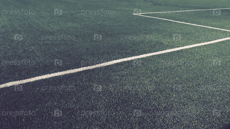 Футбольное поле для чемпионата. Разметка футбольного поля на зеленой траве. Белые линии шириной не более 12 см или 5 дюймов. Площадь футбольного поля