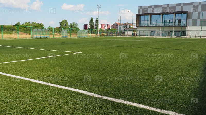 Футбольное поле с разметкой. Футбольный стадион. Спортивный фон. Спорткомплекс в городе