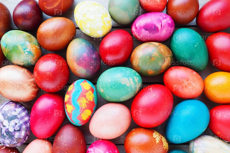Красочные пасхальные яйца крупным планом. Много красочных праздничных яиц сложены близко друг к другу. Вареные куриные яйца с цветочным и фантазийным узором. Яркий пасхальный фон