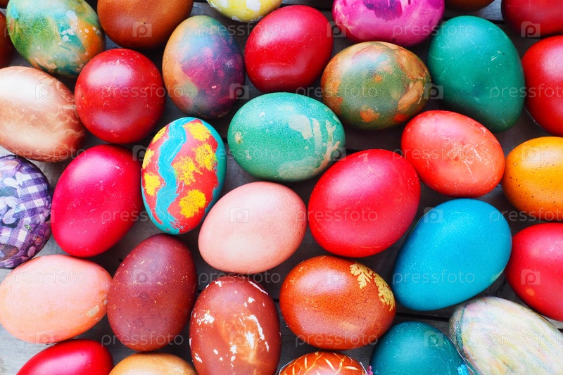 Красочные пасхальные яйца крупным планом. Много красочных праздничных яиц сложены близко друг к другу. Вареные куриные яйца с цветочным и фантазийным узором. Яркий пасхальный фон