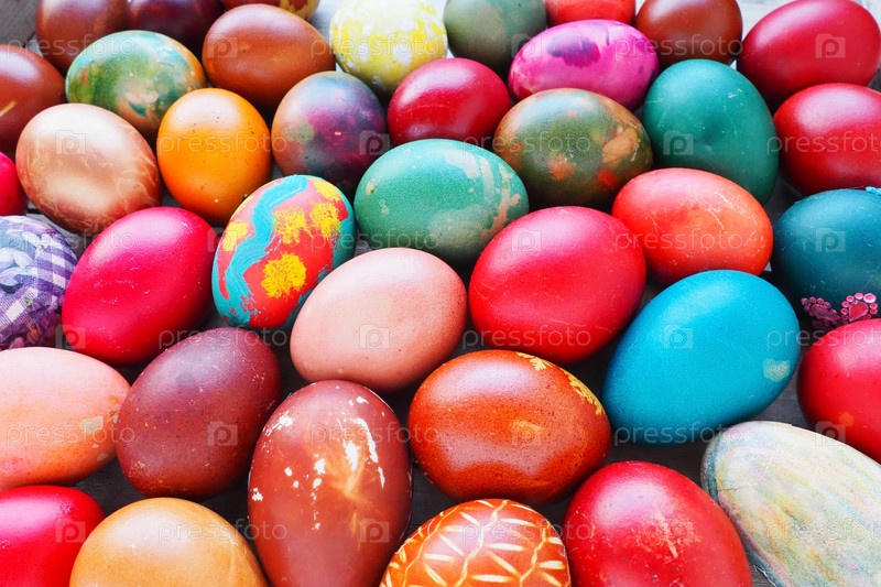 Красочные пасхальные яйца крупным планом. Много красочных праздничных яиц сложены близко друг к другу. Вареные куриные яйца с цветочным и фантазийным узором. Яркий пасхальный фон