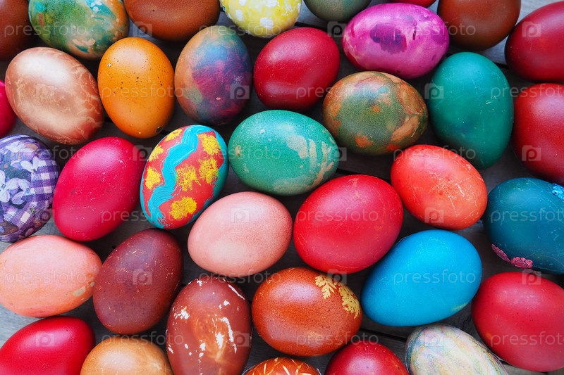 Красочные пасхальные яйца крупным планом. Много красочных праздничных яиц сложены близко друг к другу. Вареные куриные яйца с цветочным и фантазийным узором. Яркий пасхальный фон
