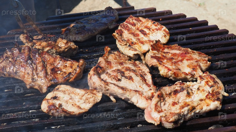 Жареные сочные мясные стейки из свинины в горящих углях на гриле для барбекю, белый дым. Хрустящая корочка. Вкусный стейк с кровью и жареными полосками. Мужская еда. Сочный полосатый стейк на гриле готов для пикника
