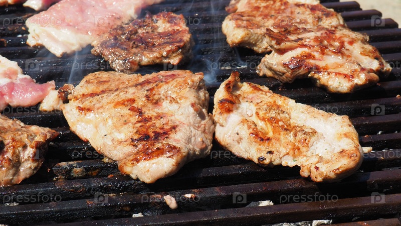 Жареные сочные мясные стейки из свинины в горящих углях на гриле для барбекю, белый дым. Хрустящая корочка. Вкусный стейк с кровью и жареными полосками. Мужская еда. Сочный полосатый стейк на гриле готов для пикника