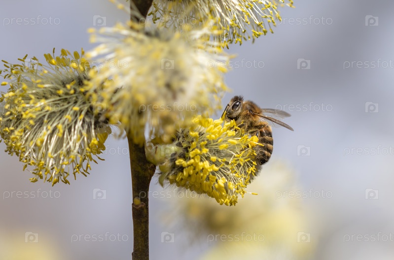 Цветение дерева Salix caprea в начале весны, пчела собирает нектар для опыления цветов