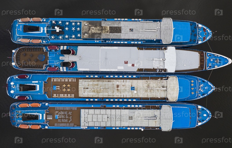 Вид сверху на верхние палубы туристических кораблей, зоны отдыха пассажиров, вид с квадрокоптера