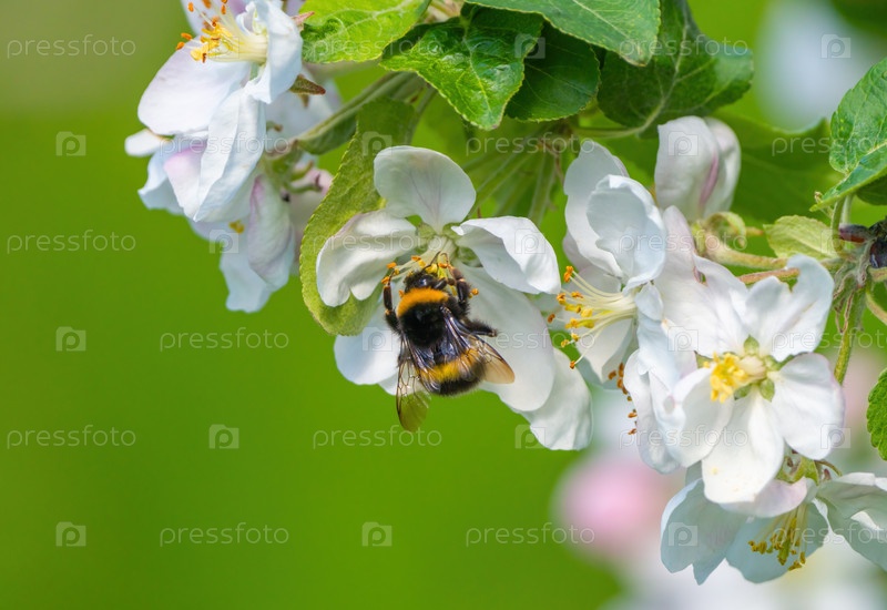 Мохнатый шмель сидит на цветке цветущей яблони, собирая нектар и опыляя растения солнечным весенним утром