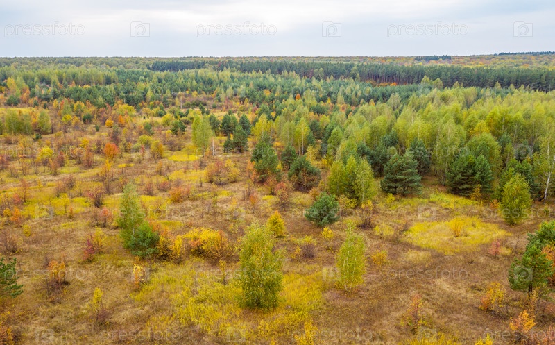 Аэрофотосъемка с квадрокоптера осенний красочный лес, красочные яркие шапки деревьев с высоты птичьего полета