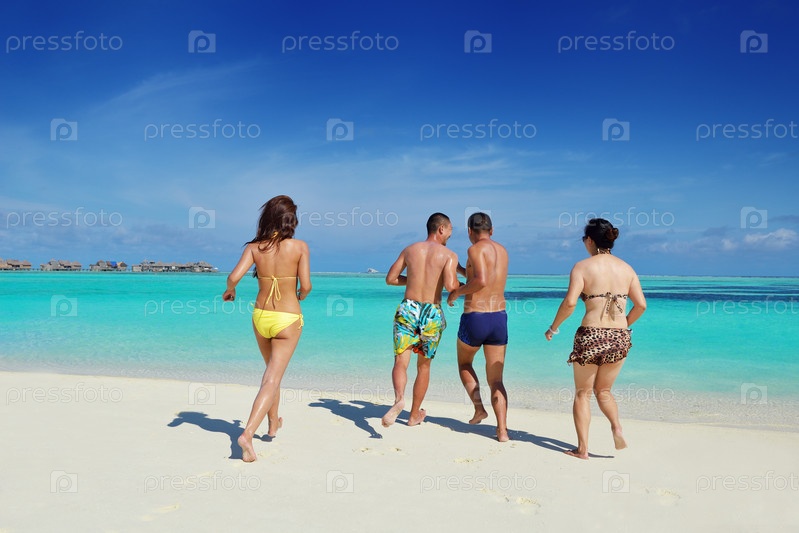 Группа счастливых молодых людей веселится на пляже