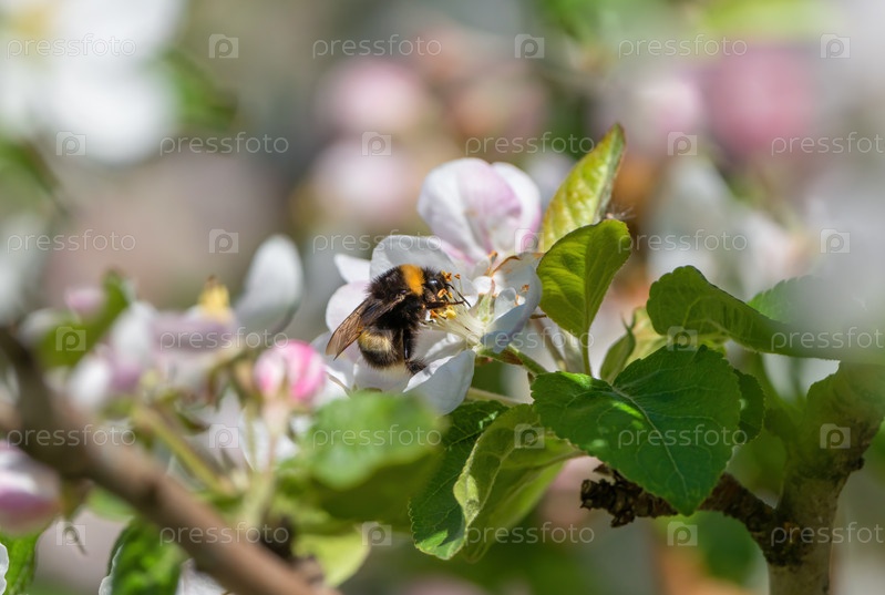 Мохнатый шмель сидит на цветке цветущей яблони, собирая нектар и опыляя растения солнечным весенним утром