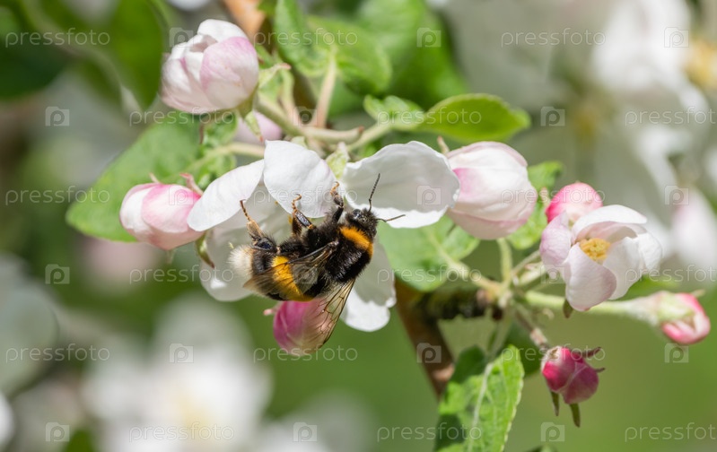 Мохнатый шмель сидит на цветке цветущей яблони, собирая нектар и опыляя растения солнечным весенним утром