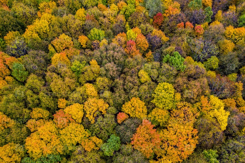 Аэрофотосъемка с квадрокоптера осенний красочный лес, красочные яркие шапки деревьев с высоты птичьего полета