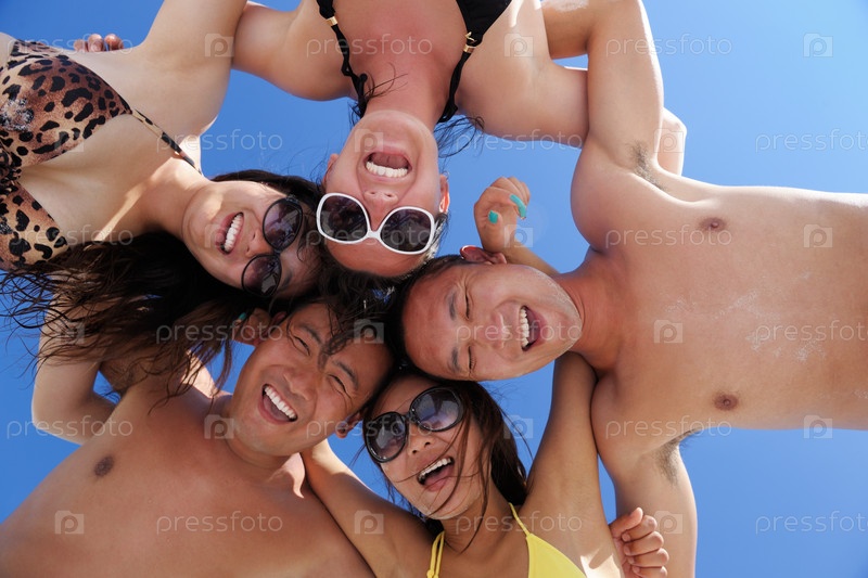 Группа счастливых молодых людей веселится на пляже