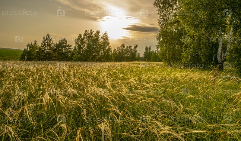 Травяной ковыль на лугу в свете заходящего солнца на фоне березовой рощи