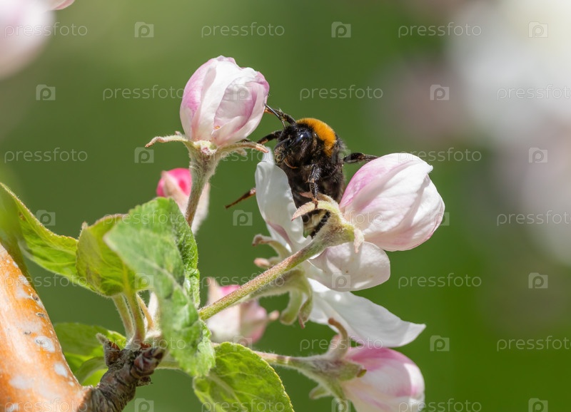 Мохнатый шмель сидит на цветке цветущей яблони, собирая нектар и опыляя растения солнечным весенним утром