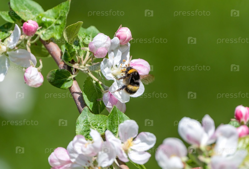 Мохнатый шмель сидит на цветке цветущей яблони, собирая нектар и опыляя растения солнечным весенним утром