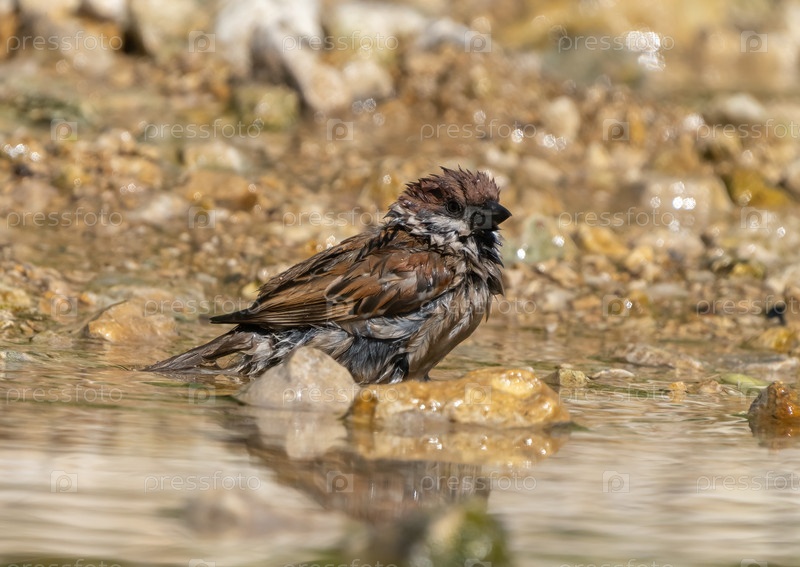 Воробей плавает в воде на скалистом берегу реки в жаркий летний день