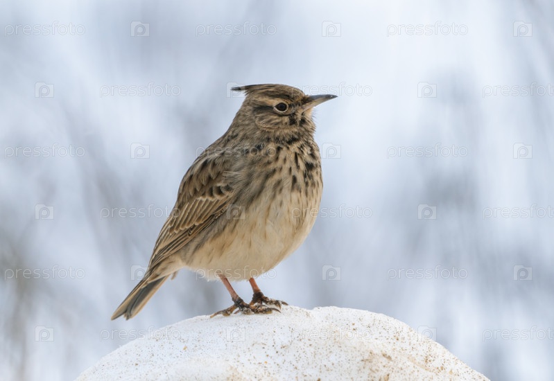 Птица Galerida cristata в крупном плане на сугробе зимнего морозного дня