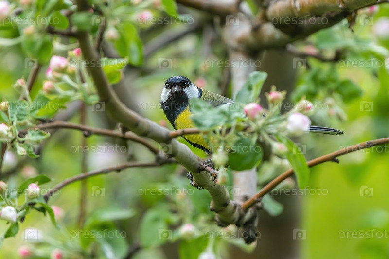 Ранней весной большая птица Парус сидит на ветке цветущей яблони среди красивых розовых цветов